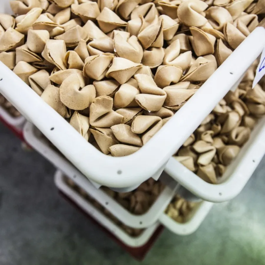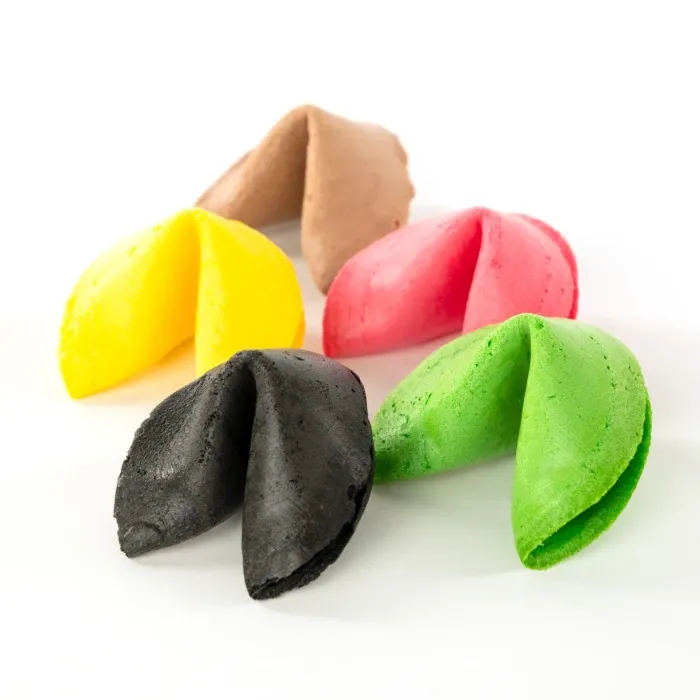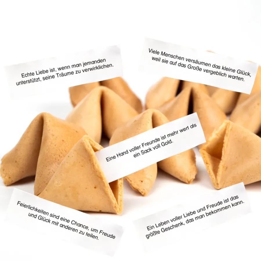 Unsere Glückskekse sind mehr als nur ein Snack – sie sind Botschafter Ihrer Kreativität und Werte. Als regionaler Produzent legen wir großen Wert auf Nachhaltigkeit und stellen täglich bis zu 20.000 Kekse her. Schon ab einer Kleinmenge von 500 Stück können Sie bei uns Glückskekse ganz nach Ihrem Geschmack individualisieren. Wählen Sie zwischen verschiedenen Geschmacksrichtungen, bunten Keksen oder passen Sie die Außenfolie individuell an Ihre Marke an. Der Innenzettel jedes Kekses lässt sich komplett nach Ihren Wünschen gestalten – ideal für personalisierte Nachrichten oder Markenbotschaften.
